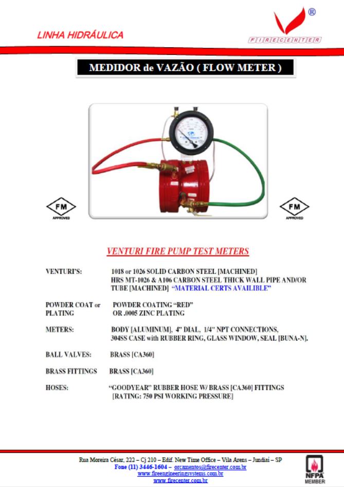 O Flow Meter ( Medidor de Vazão ) é um  equipamento destinado a medir a vazão das bombas do sistema de combate à incêndio, permitindo o levantamento da curva real de operação da bomba.